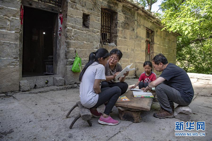 馬武寨寄宿制小學(xué)語(yǔ)文老師崔連瑞(左二)和校長(zhǎng)趙金成在南背村三姐弟的家里為孩子們輔導(dǎo)功課(5月31日攝)。新華社記者楊晨光攝。