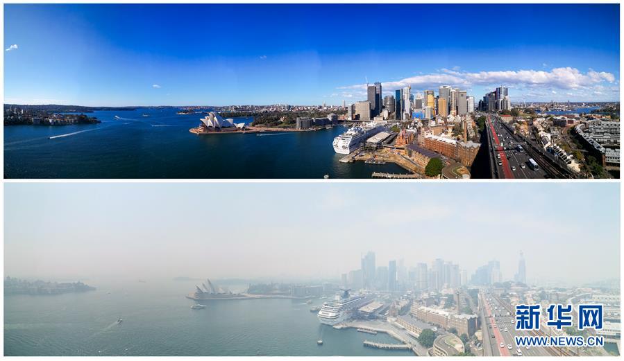 這張拼版照片顯示的是2018年7月6日(上)和2019年12月19日拍攝的澳大利亞悉尼港區(qū)的空氣質(zhì)量對比效果。2019年中至2020年初,持續(xù)半年左右的澳大利亞森林火災(zāi)造成嚴重的環(huán)境災(zāi)難。6月5日是第47個聯(lián)合國世界環(huán)境日,今年的主題為“關(guān)愛自然刻不容緩”。新華社記者白雪飛攝。