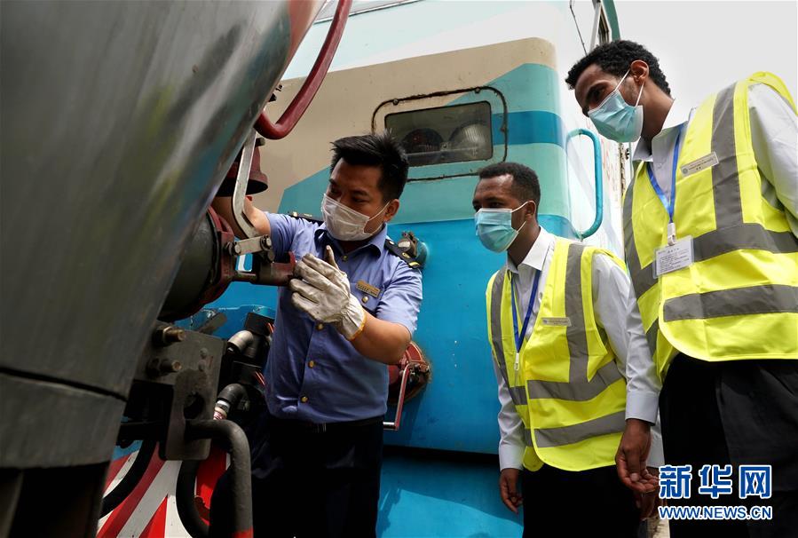6月5日,帶教司機(jī)在教伊迪內(nèi)卡邱(中)和特瑞薩(右)進(jìn)行機(jī)車檢查作業(yè)。 新華社記者 李安 攝