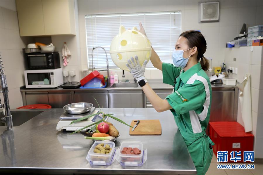 香港海洋公園陸生動物部監(jiān)督殷漫萍在熊貓廚房介紹對熊貓的訓(xùn)練(5月11日攝)。新華社記者吳曉初攝