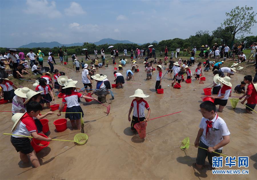 6月7日,孩子和家長們參加渾水摸魚趣味活動。新華社記者徐昱攝