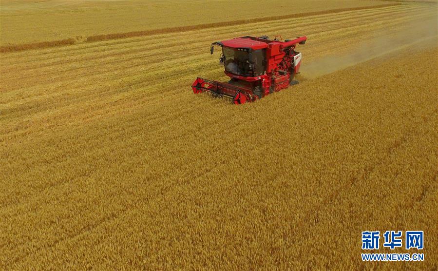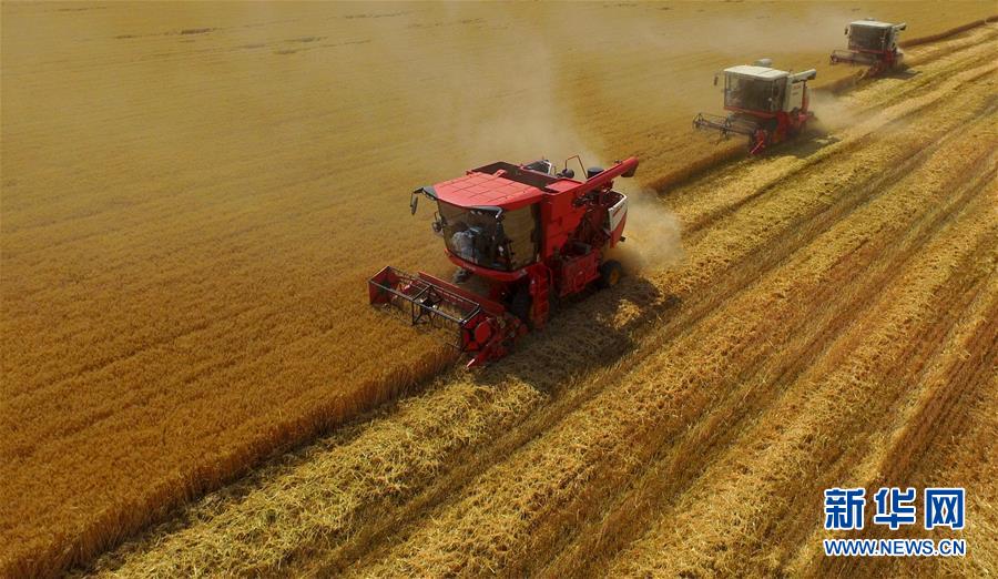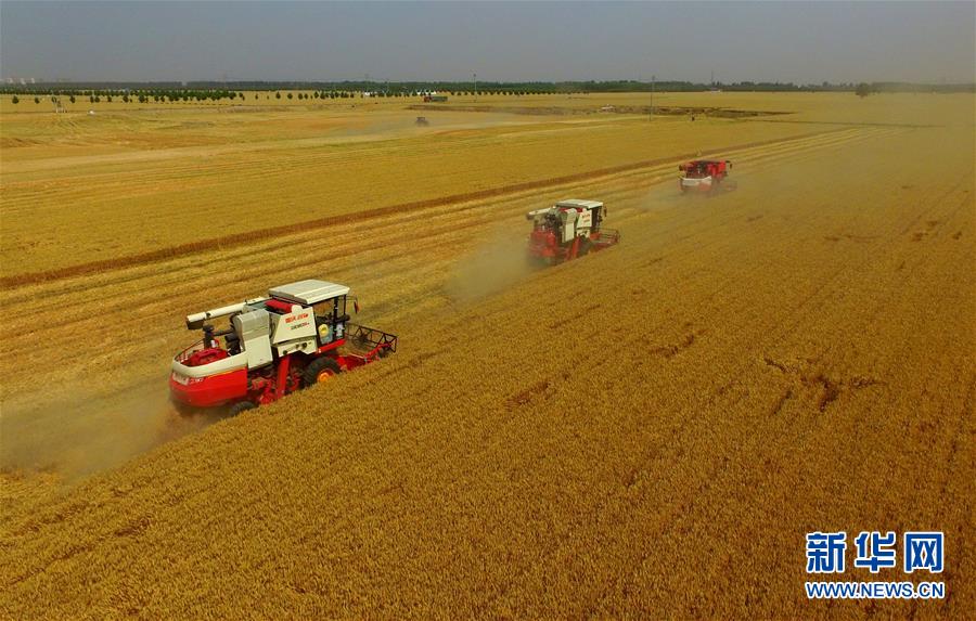 6月8日,聯(lián)合收割機(jī)在河北省南和縣閆里鄉(xiāng)閆里村麥田進(jìn)行夏收作業(yè)(無(wú)人機(jī)照片)。“三夏”期間,河北省預(yù)計(jì)組織和調(diào)度小麥聯(lián)合收割機(jī)、拖拉機(jī)、夏玉米播種機(jī)等200萬(wàn)臺(tái)農(nóng)業(yè)機(jī)械投入作業(yè)。新華社記者朱旭東攝