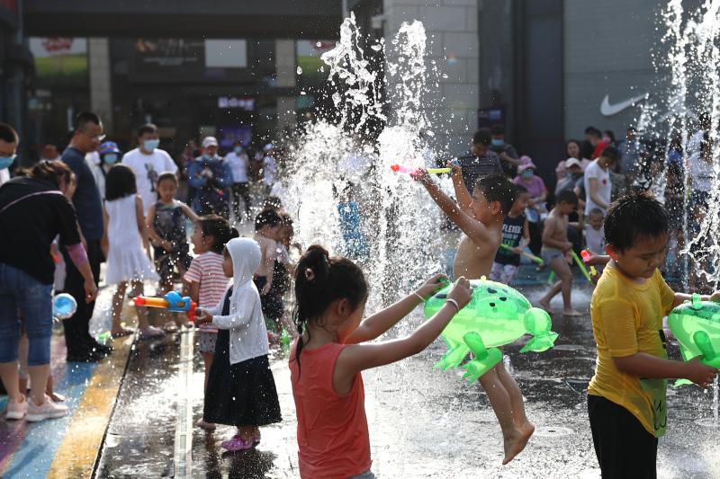 2020年6月7日,北京,華西熙LIVE的噴泉水池成為孩童的戲水降暑天堂。北京6日下午發(fā)高溫藍(lán)色預(yù)警,預(yù)計6月7日至8日,北京大部分地區(qū)日最高氣溫達(dá)36℃以上。