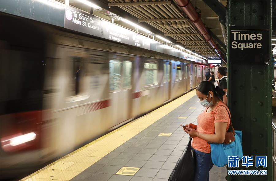 6月8日,佩戴口罩的乘客在美國紐約一地鐵站內等車,地面上安置了保持社交距離的標記。在因新冠疫情進入“居家令”近三個月之后,美國紐約市于當地時間8日開始“解封”,進入經濟重啟的第一階段。新華社記者王迎攝