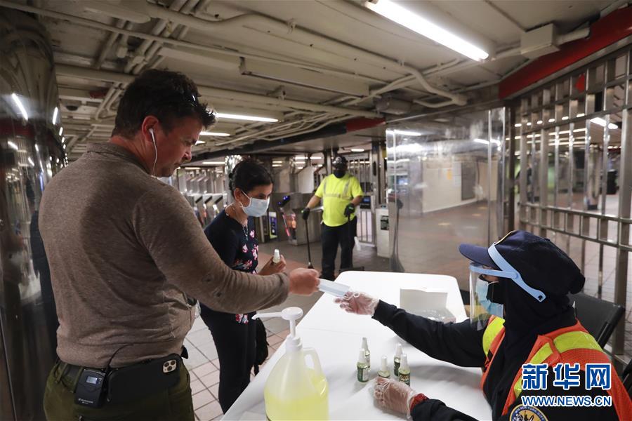 6月8日,在美國紐約,地鐵工作人員為乘客發(fā)放洗手液和口罩。在因新冠疫情進入“居家令”近三個月之后,美國紐約市于當地時間8日開始“解封”,進入經濟重啟的第一階段。新華社記者王迎攝