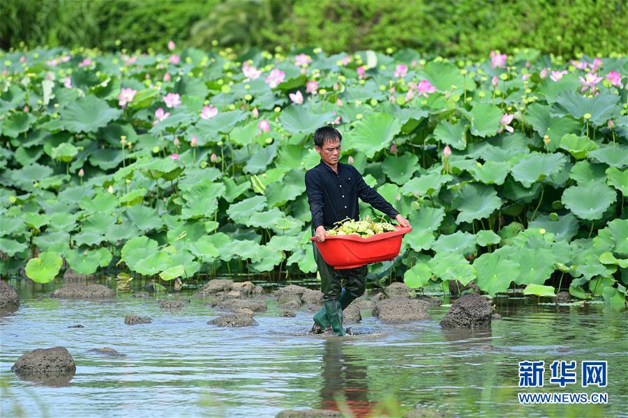 6月9日,村民在??邶埲A區(qū)龍泉鎮(zhèn)椰子頭村搬運采摘的蓮蓬。初夏時節(jié),位于海南??邶埲A區(qū)龍泉鎮(zhèn)的蓮蓬逐漸成熟,當?shù)卮迕窦泳o采摘,一派繁忙景象。新華社記者蒲曉旭攝