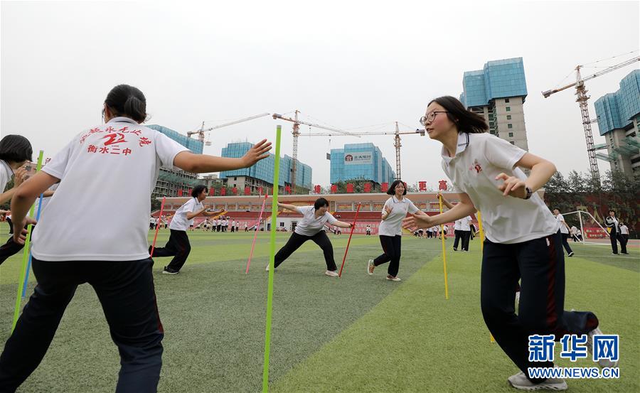 6月9日,河北省衡水市第二中學(xué)的高三學(xué)生在操場(chǎng)上參加減壓趣味游戲。2020年高考臨近,河北省衡水市第二中學(xué)組織開展多種形式的集體“減壓”活動(dòng),幫助高三學(xué)生在緊張備考之余釋放身心壓力,以輕松、樂(lè)觀、自信的心態(tài)迎接高考。新華社記者朱旭東攝