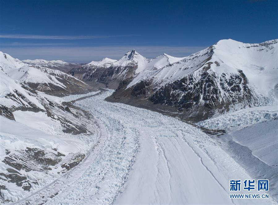 這是珠峰腳下的絨布冰川(無人機照片,5月10日攝)。從空中俯瞰珠穆朗瑪峰北坡,生機勃勃的高原濕地、蜿蜒曲折的盤山公路、壯麗秀美的絨布冰川,還有安靜的村莊和熱鬧的登山營地,共同構成一幅壯美畫卷。新華社記者孫非攝
