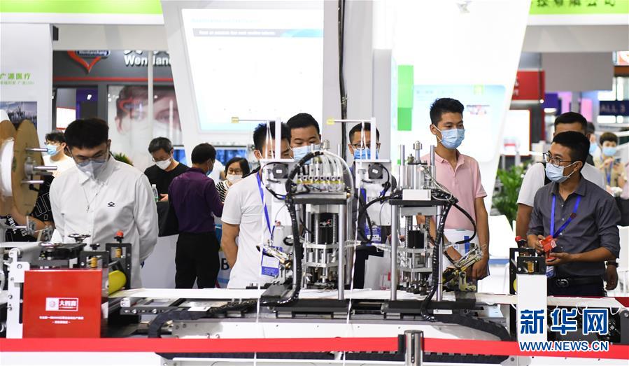 6月10日,觀眾參觀展會上的一臺口罩生產(chǎn)設(shè)備。當(dāng)日,廣州國際防疫物資展覽會在保利世貿(mào)博覽館舉行。本次展會面積共計(jì)3.6萬平方米,設(shè)有防疫產(chǎn)品、設(shè)備、綜合服務(wù)、原輔料等4個展區(qū),參展企業(yè)約600家。新華社記者鄧華攝