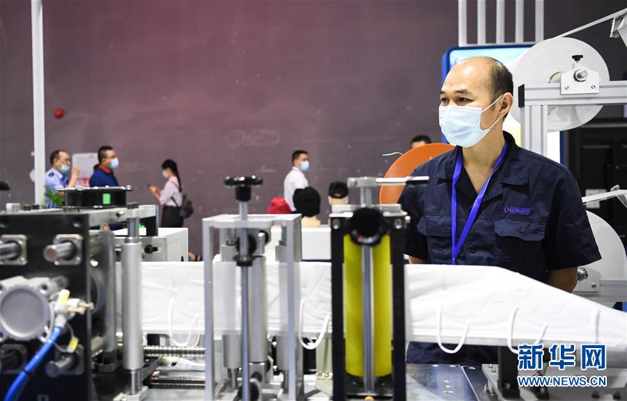 6月10日,參展工作人員站在一臺KN95口罩生產設備旁。當日,廣州國際防疫物資展覽會在保利世貿博覽館舉行。本次展會面積共計3.6萬平方米,設有防疫產品、設備、綜合服務、原輔料等4個展區(qū),參展企業(yè)約600家。新華社記者鄧華攝