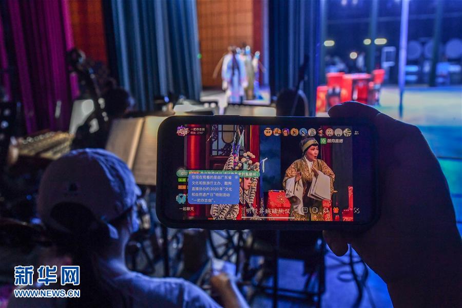 6月12日,直播工作人員探訪廣東粵劇院后臺(tái)。當(dāng)日,廣東粵劇院聯(lián)合酷狗網(wǎng)絡(luò)直播平臺(tái)推出“周末睇大戲(線上版)”,將線下劇場(chǎng)轉(zhuǎn)移到線上,在酷狗直播間里呈現(xiàn)粵劇的經(jīng)典劇目,為劇迷們打造一場(chǎng)“云端”盛宴。新華社記者 劉大偉 攝
