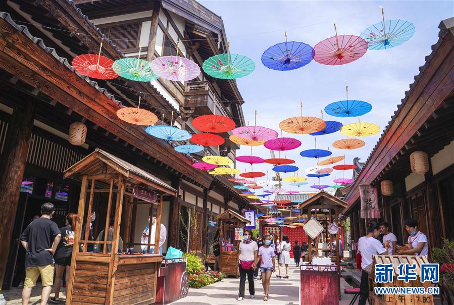 6月13日,市民在長春市世茂蓮花山小鎮(zhèn)寬厚里商街參觀游覽。當(dāng)日是“文化和自然遺產(chǎn)日”。吉林長春首屆蓮花山消夏生活節(jié)在世茂蓮花山小鎮(zhèn)舉行?;顒訉⒎沁z展示與假日消暑休閑相結(jié)合,讓游人在“古色古香”的油紙傘巷中品傳統(tǒng)文化魅力,享夏日休閑愜意。新華社記者許暢攝。