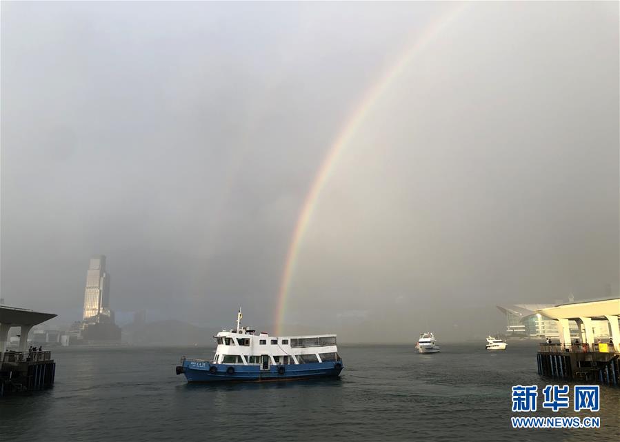 香港維多利亞港上空出現(xiàn)彩虹(6月16日攝)。6月16日傍晚,雨后的香港維多利亞港上空出現(xiàn)彩虹,美麗景色吸引市民駐足拍照。新華社記者 李鋼 攝
