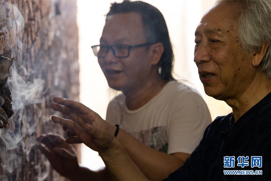 6月17日,在位于浙江慈溪的工作室,聞長(zhǎng)慶和兒子聞果立檢查新窯的窯壁。新華社記者 翁忻旸 攝