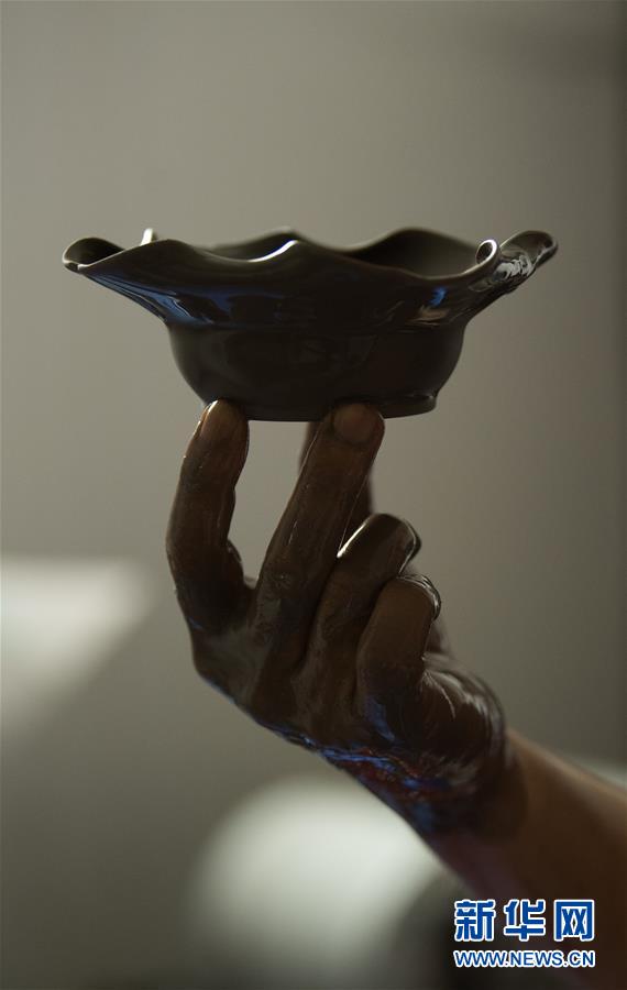 6月17日,在位于浙江慈溪的工作室,聞長(zhǎng)慶查看一件剛浸釉完畢的盞托。新華社記者 翁忻旸 攝