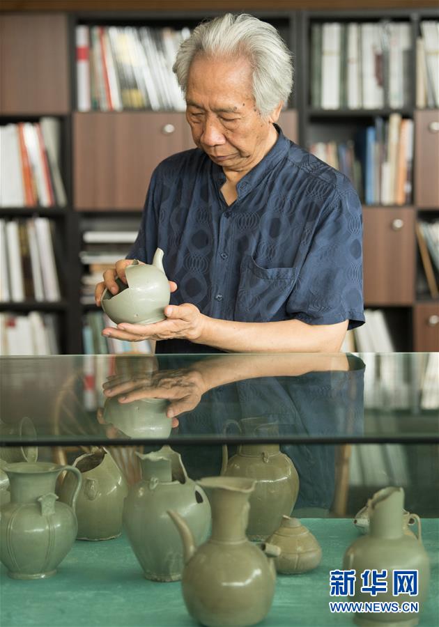 6月17日,在位于浙江慈溪的工作室,聞長慶查看自己收藏的古越窯標(biāo)本。新華社記者 翁忻旸 攝