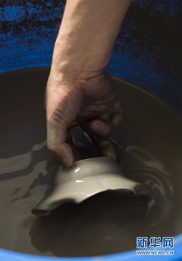 6月17日,在位于浙江慈溪的工作室,聞長(zhǎng)慶將一件盞托浸入用本地草木灰調(diào)制的釉料中。新華社記者 翁忻旸 攝