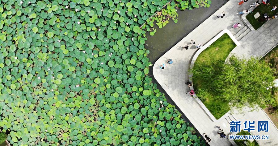 6月19日拍攝的大明湖畔的荷花池(無(wú)人機(jī)照片)。近日,山東濟(jì)南大明湖的荷花陸續(xù)綻放,吸引游客前來(lái)觀賞。新華社記者 王凱 攝