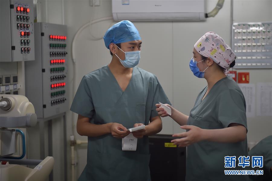 6月19日,在北京地壇醫(yī)院隔離病區(qū)護士站,白班護士(右)和夜班護士在做交接。新華社記者彭子洋攝
