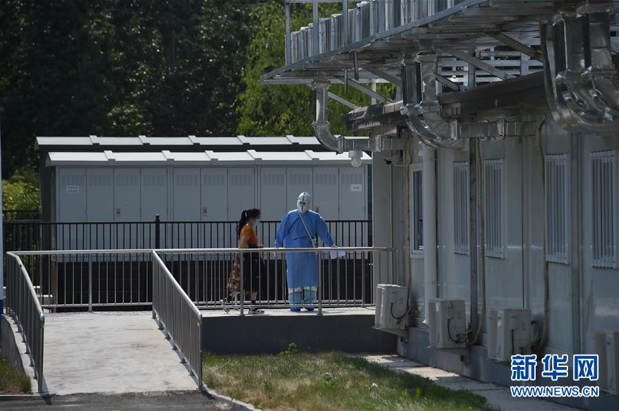 6月19日,在北京地壇醫(yī)院隔離病區(qū)外,一名新收治的病人(左)準備進入隔離病區(qū)。新華社記者彭子洋攝