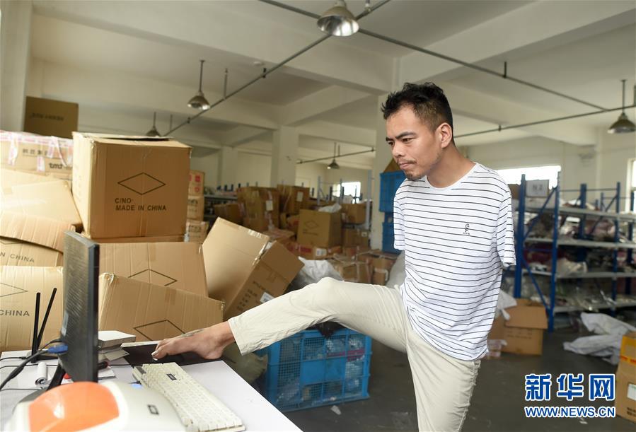 6月12日,金江偉用腳控制鼠標(biāo)打印網(wǎng)店訂單。今年34歲的金江偉是浙江省諸暨市楓橋鎮(zhèn)樂(lè)山村村民。5歲時(shí)的一場(chǎng)意外讓他失去了雙臂,但金江偉沒(méi)有向命運(yùn)屈服。從2016年起,金江偉和弟弟開(kāi)始在電商領(lǐng)域創(chuàng)業(yè),開(kāi)網(wǎng)店銷售襪子,金江偉負(fù)責(zé)網(wǎng)店策劃和客服。經(jīng)過(guò)苦練,他用腳打字的速度已經(jīng)與常人無(wú)異。在他的努力下,這幾年網(wǎng)店年銷售額超過(guò)100萬(wàn)元。新華社記者韓傳號(hào)攝