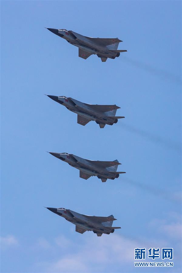 6月20日,在俄羅斯首都莫斯科,米格-31K戰(zhàn)斗機編隊參加閱兵式彩排。俄羅斯將于6月24日舉行紀(jì)念衛(wèi)國戰(zhàn)爭勝利75周年閱兵式。新華社記者白雪騏攝
