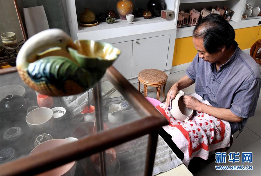 在河南省鞏義市站街鎮(zhèn)小黃冶村的工作室里,游光明在施釉前對器物進(jìn)行打磨(6月19日攝)。新華社記者李安攝