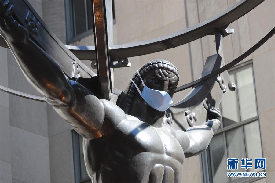 6月22日,在美國紐約洛克菲勒中心,一座雕像被“戴”上口罩。美國約翰斯·霍普金斯大學(xué)22日發(fā)布的新冠疫情最新統(tǒng)計數(shù)據(jù)顯示,美國累計死亡病例超過12萬例。新華社記者王迎攝