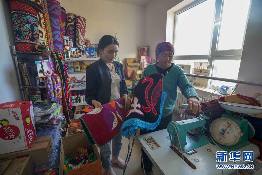 在吉木乃縣萬(wàn)駝園內(nèi),古麗丁·米拉木別克(左)和母親在自家的超市里整理商品(6月21日攝)。新華社記者趙戈攝