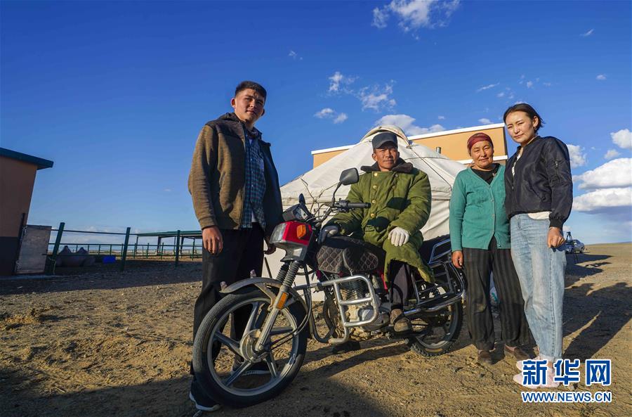 在吉木乃縣萬(wàn)駝園內(nèi),牧民米拉木別克·阿依提克(右)在兒子的幫助下準(zhǔn)備騎著摩托車去交駝奶(6月21日攝)。新華社記者趙戈攝