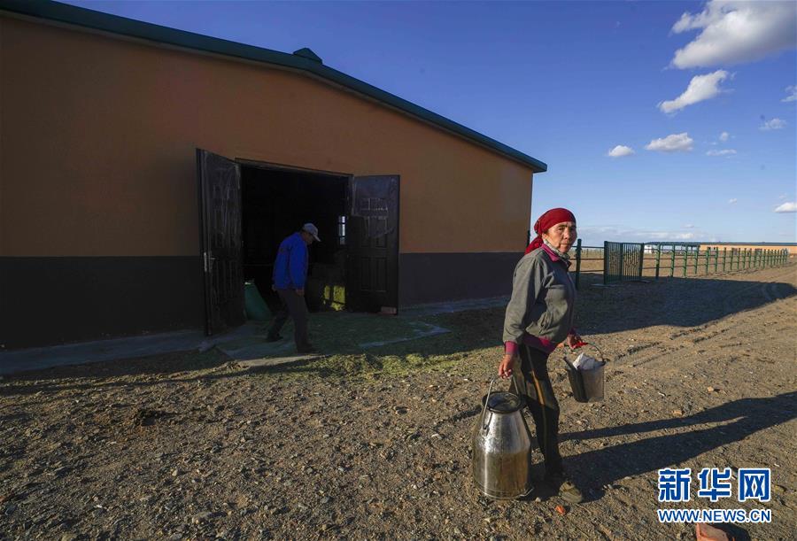 在吉木乃縣萬(wàn)駝園內(nèi),一位牧民將剛收集的駱駝奶交到收奶處(6月21日攝)。新華社記者趙戈攝