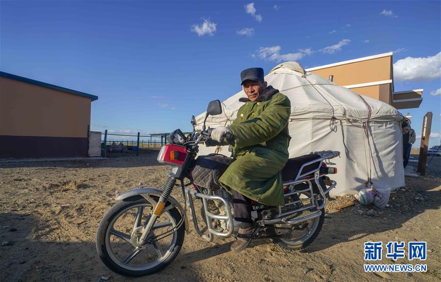 在吉木乃縣萬(wàn)駝園內(nèi),傍晚時(shí)分,牧民米拉木別克·阿依提克準(zhǔn)備騎著摩托車將駱駝趕回圈內(nèi)(6月21日攝)。新華社記者趙戈攝