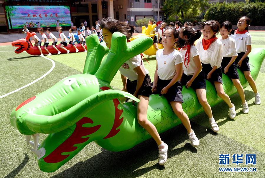 6月24日,西安市新城區(qū)后宰門小學(xué)的學(xué)生在進行旱地龍舟比賽。端午節(jié)臨近,各地舉行包粽子、做香包、賽龍舟等豐富多彩的民俗文化活動,迎接傳統(tǒng)佳節(jié)的到來。新華社記者劉瀟攝