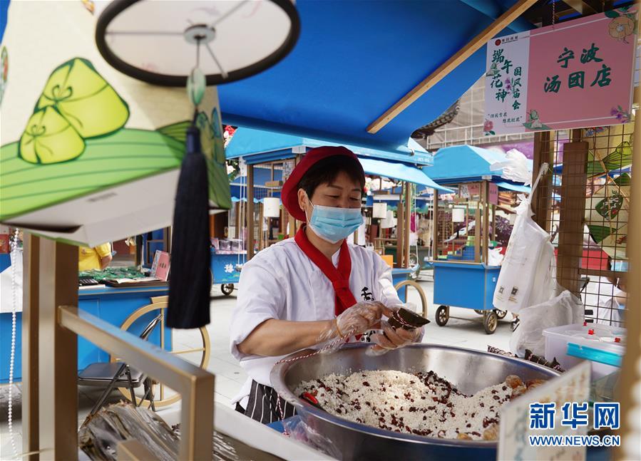 6月24日,在上海豫園舉辦的端午花神國風(fēng)廟會上,老字號寧波湯團(tuán)店的師傅在包制傳統(tǒng)的“枕頭粽”。端午節(jié)臨近,各地舉行包粽子、做香包、賽龍舟等豐富多彩的民俗文化活動,迎接傳統(tǒng)佳節(jié)的到來。新華社記者劉穎攝