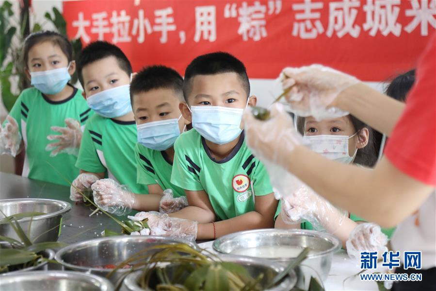 6月24日,在河北省廊坊市安次區(qū)西小街社區(qū)活動中心,孩子們學(xué)習(xí)包粽子。端午節(jié)臨近,各地舉行包粽子、做香包、賽龍舟等豐富多彩的民俗文化活動,迎接傳統(tǒng)佳節(jié)的到來。新華社記者王曉攝
