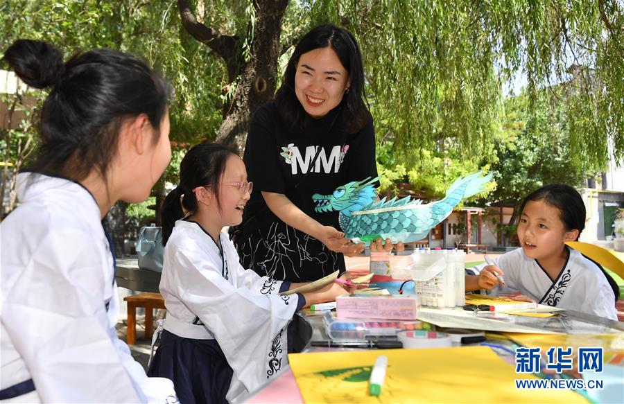 6月24日,西安市新城區(qū)后宰門小學(xué)的老師指導(dǎo)學(xué)生制作紙質(zhì)龍舟模型。端午節(jié)臨近,各地舉行包粽子、做香包、賽龍舟等豐富多彩的民俗文化活動,迎接傳統(tǒng)佳節(jié)的到來。新華社記者劉瀟攝