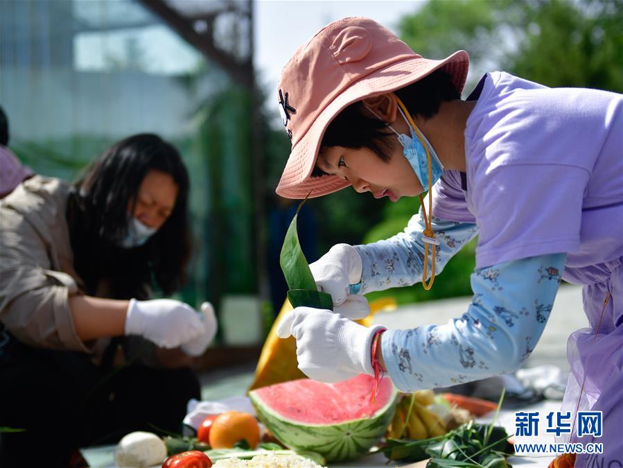 6月25日,在青海省西寧野生動(dòng)物園,一位小朋友在給粽子裝餡料。新華社記者 張龍 攝