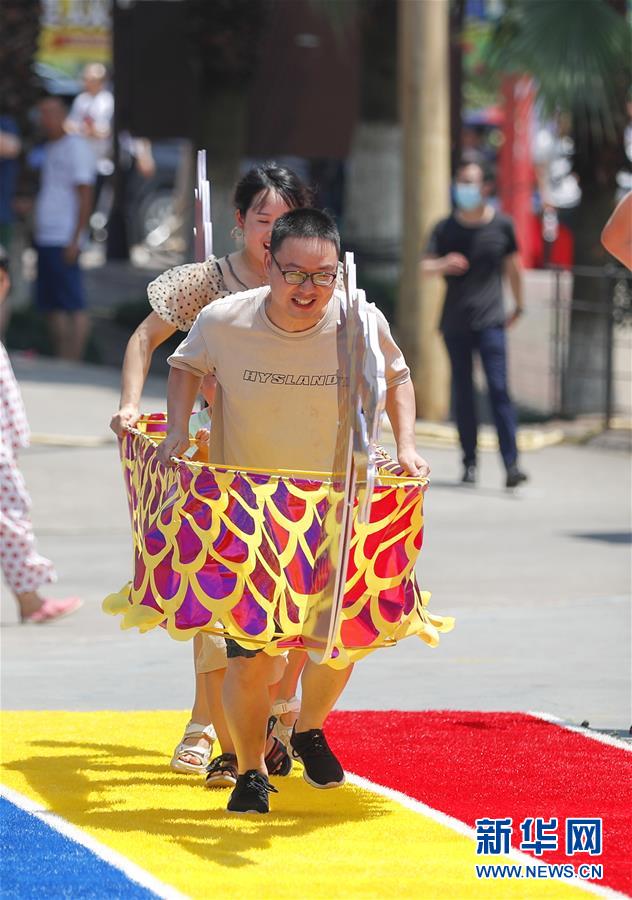 6月25日,在重慶市涪陵區(qū)美心紅酒小鎮(zhèn)舉辦的端午傳統(tǒng)民俗體驗活動中,市民參加“旱地龍舟”比賽。新華社記者 黃偉 攝