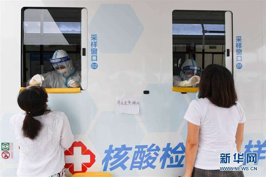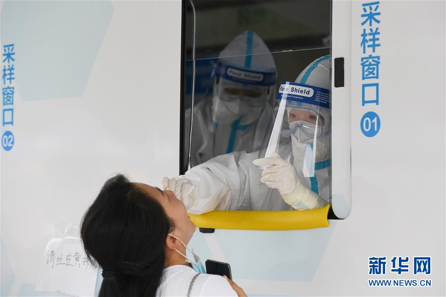6月28日,在北京市西城區(qū)北京展覽館南側(cè)的露天廣場(chǎng)核酸檢測(cè)采樣點(diǎn),核酸檢測(cè)采樣車內(nèi)的醫(yī)護(hù)人員為前來(lái)做檢測(cè)的人員進(jìn)行采樣。新華社記者鞠煥宗攝