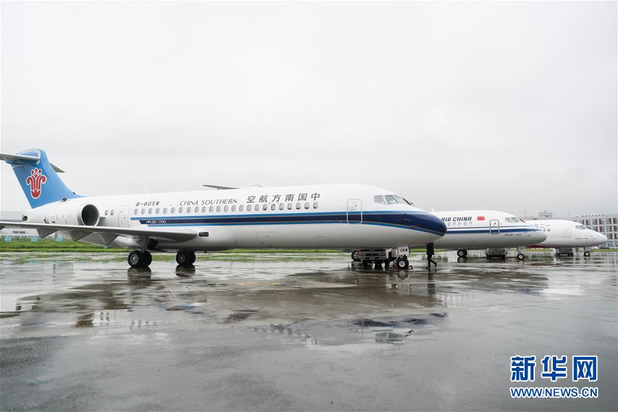 6月28日,三架嶄新涂裝的國產(chǎn)新支線客機ARJ21飛機停放在中國商用飛機有限責任公司總裝基地內(nèi)。當日,三架嶄新涂裝的國產(chǎn)新支線客機ARJ21飛機在位于上海浦東的中國商用飛機有限責任公司總裝基地集結(jié),分別交付給國航、東航、南航三大航空公司,標志著ARJ21進入我國主流民航市場。新華社記者丁汀攝