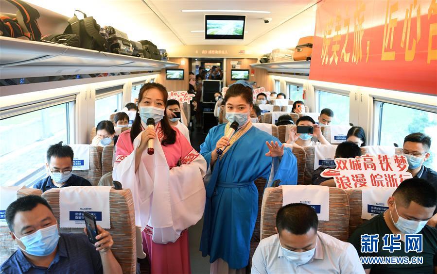 6月28日,合肥客運(yùn)段工作人員在合肥南至杭州東的G9394次列車(chē)上為旅客表演節(jié)目。新華社記者劉軍喜攝