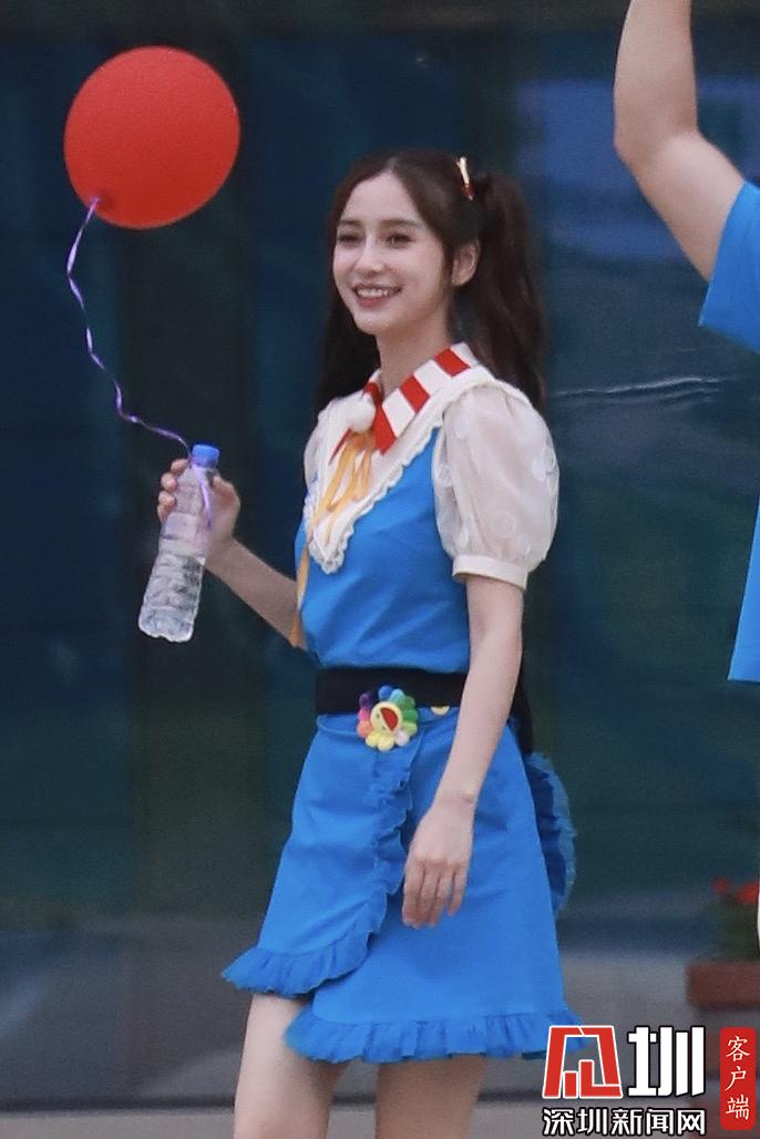 楊穎(angelababy)穿藍(lán)色背帶裙扎雙馬尾清新可愛(ài)