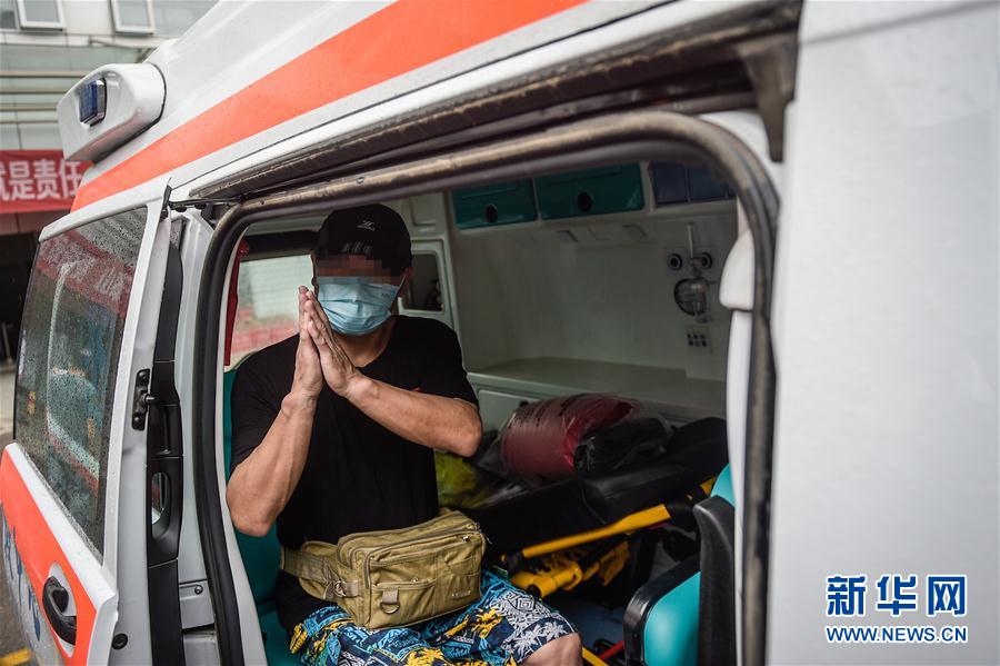 6月29日,在北京地壇醫(yī)院,患者何先生向送行的人們表示感謝。