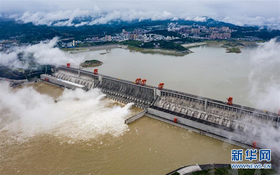 6月29日,三峽樞紐開(kāi)啟泄洪孔泄洪(無(wú)人機(jī)照片)。受長(zhǎng)江中上游強(qiáng)降雨影響,進(jìn)入三峽水庫(kù)的水量持續(xù)增多。為騰出一定庫(kù)容迎接近期可能到來(lái)的洪水,三峽樞紐于6月29日上午開(kāi)啟兩個(gè)泄洪孔,加大下泄流量。這是三峽樞紐今年首次泄洪。28日14時(shí),三峽水庫(kù)入庫(kù)流量達(dá)4萬(wàn)立方米/秒,是27日14時(shí)的兩倍。為應(yīng)對(duì)此輪來(lái)水,長(zhǎng)江防總要求將三峽水庫(kù)下泄流量上調(diào)至日均3.5萬(wàn)立方米/秒。新華社發(fā)(鄭家裕攝)