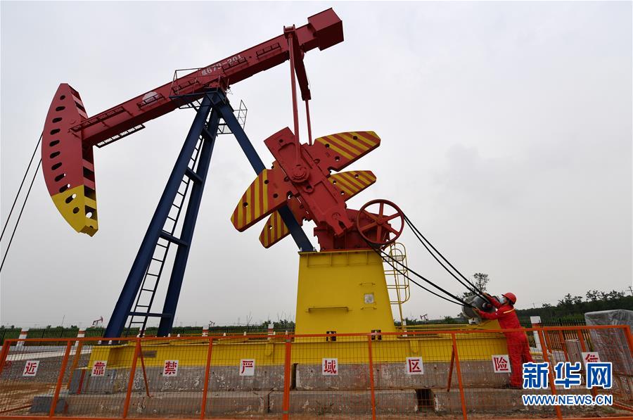 6月29日,馮萌萌在大港油田采油二廠二區(qū)內(nèi)檢查機器皮帶磨損情況。新華社記者李然攝