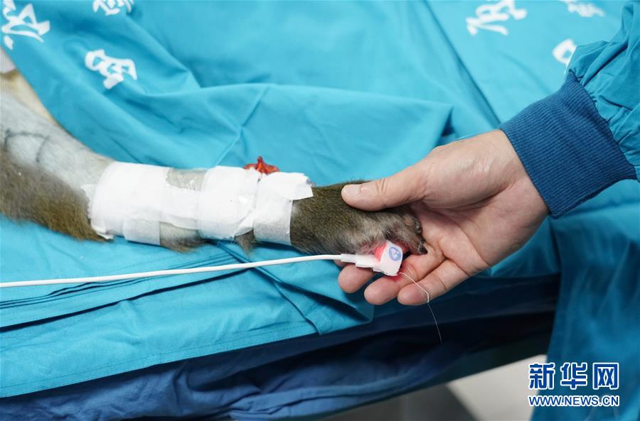 6月29日,研究人員在病房內(nèi)為移植肝受體猴按摩手部。日前,多基因編輯豬-恒河猴異種肝、心、腎器官移植在位于陜西西安的空軍軍醫(yī)大學(xué)西京醫(yī)院順利實(shí)施。研究團(tuán)隊(duì)使用豬內(nèi)源性逆轉(zhuǎn)錄病毒(PERV)敲除的13個(gè)基因修飾豬作為供體,將一個(gè)供體豬的肝、心、腎分別移植給3只恒河猴受體。目前,移植肝和對(duì)應(yīng)的受體猴已存活16天,突破國際上的豬-猴輔助性肝移植最長存活時(shí)間記錄。這項(xiàng)研究有助于未來解決器官短缺造成的臨床器官移植發(fā)展受限難題。新華社記者邵瑞攝