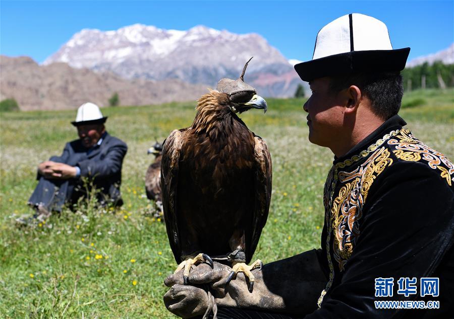 6月29日,庫(kù)爾馬西·胡特曼的徒弟們圍坐在草地上交流馴鷹技藝。新華社記者宋彥樺攝