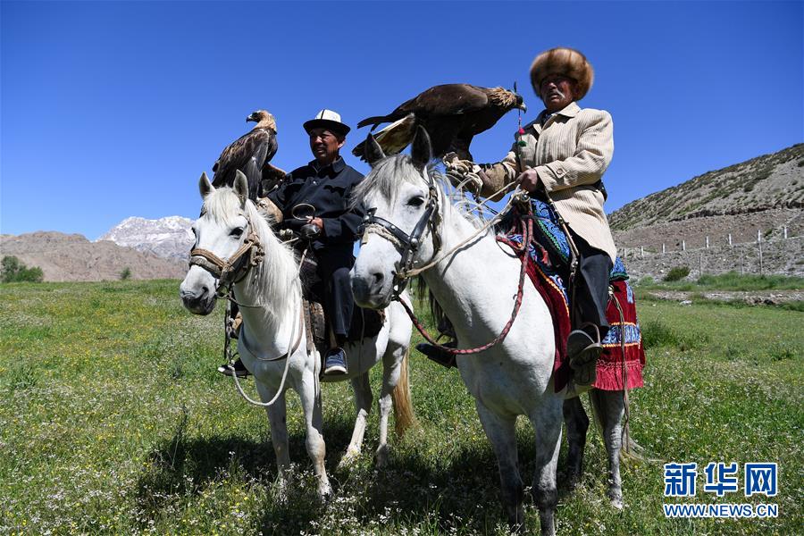 6月29日,庫(kù)爾馬西·胡特曼(右)和他的徒弟帶著獵鷹出游。新華社記者宋彥樺攝