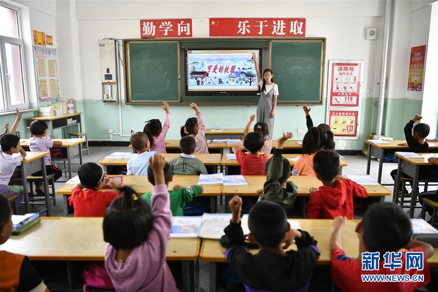 寧夏銀川市永寧縣閩寧鎮(zhèn)原隆村原隆小學(xué),老師在用電子屏給一年級(jí)的孩子們上課(2019年9月3日攝)。新華社記者王鵬攝