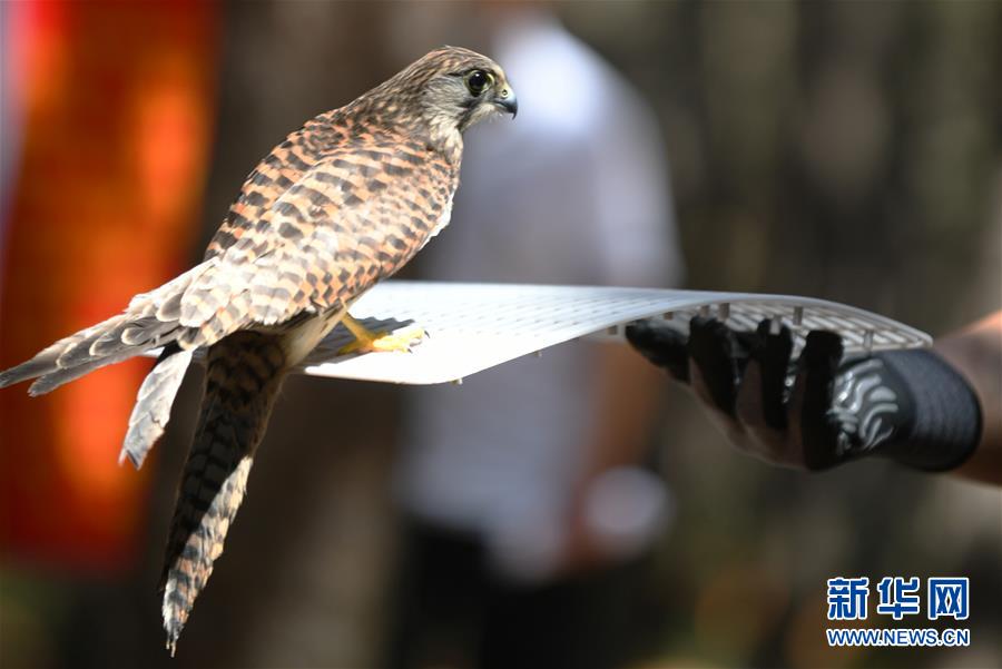 7月1日,在吉林省東北虎園,工作人員放飛一只紅隼。新華社記者林宏攝